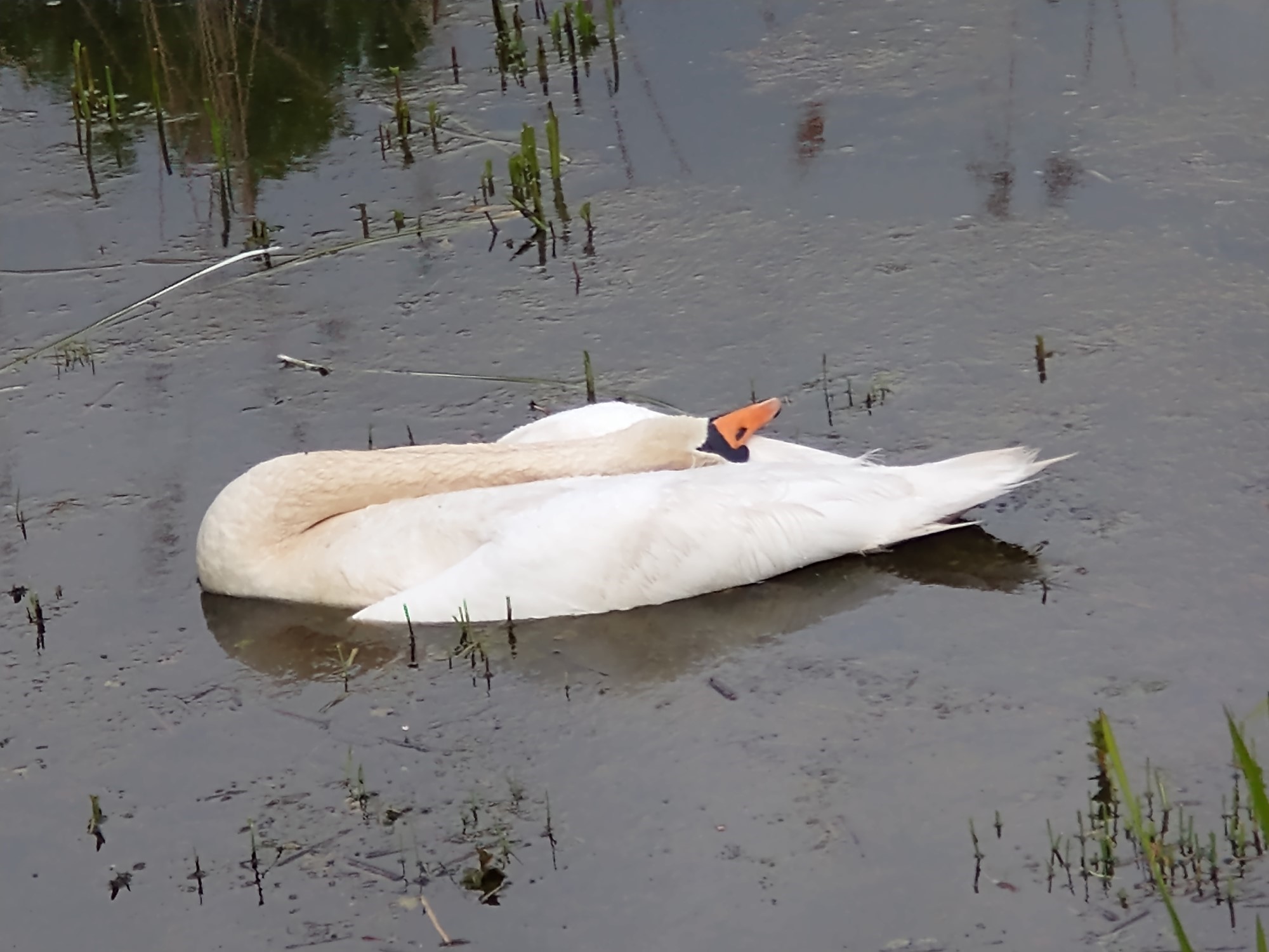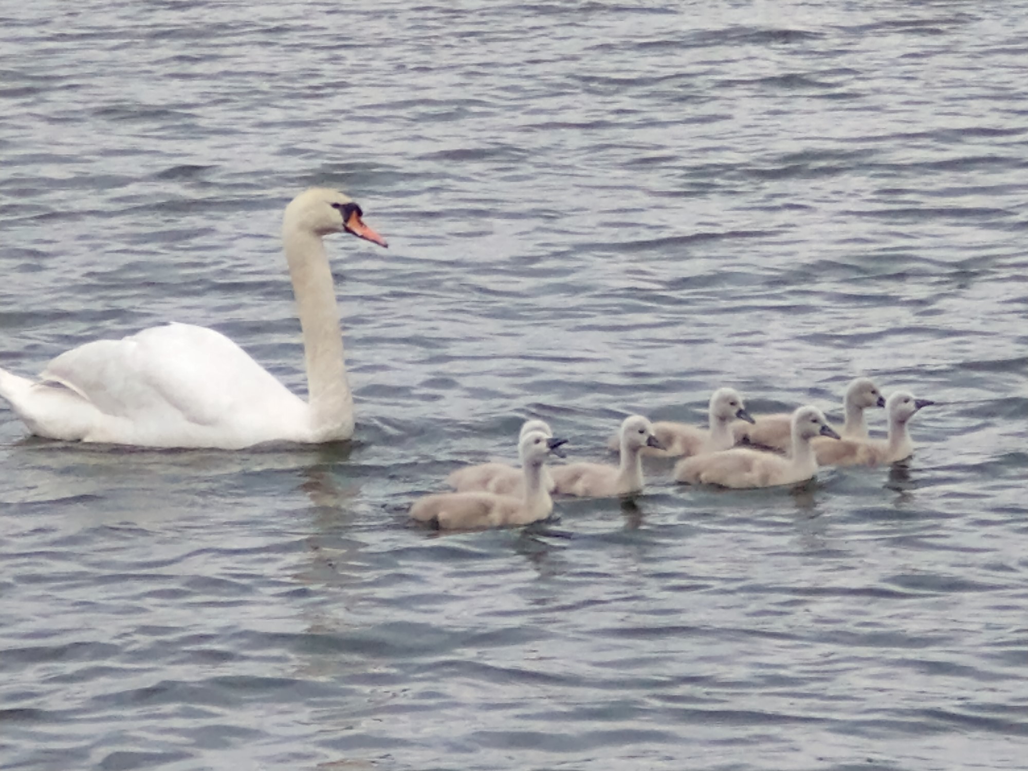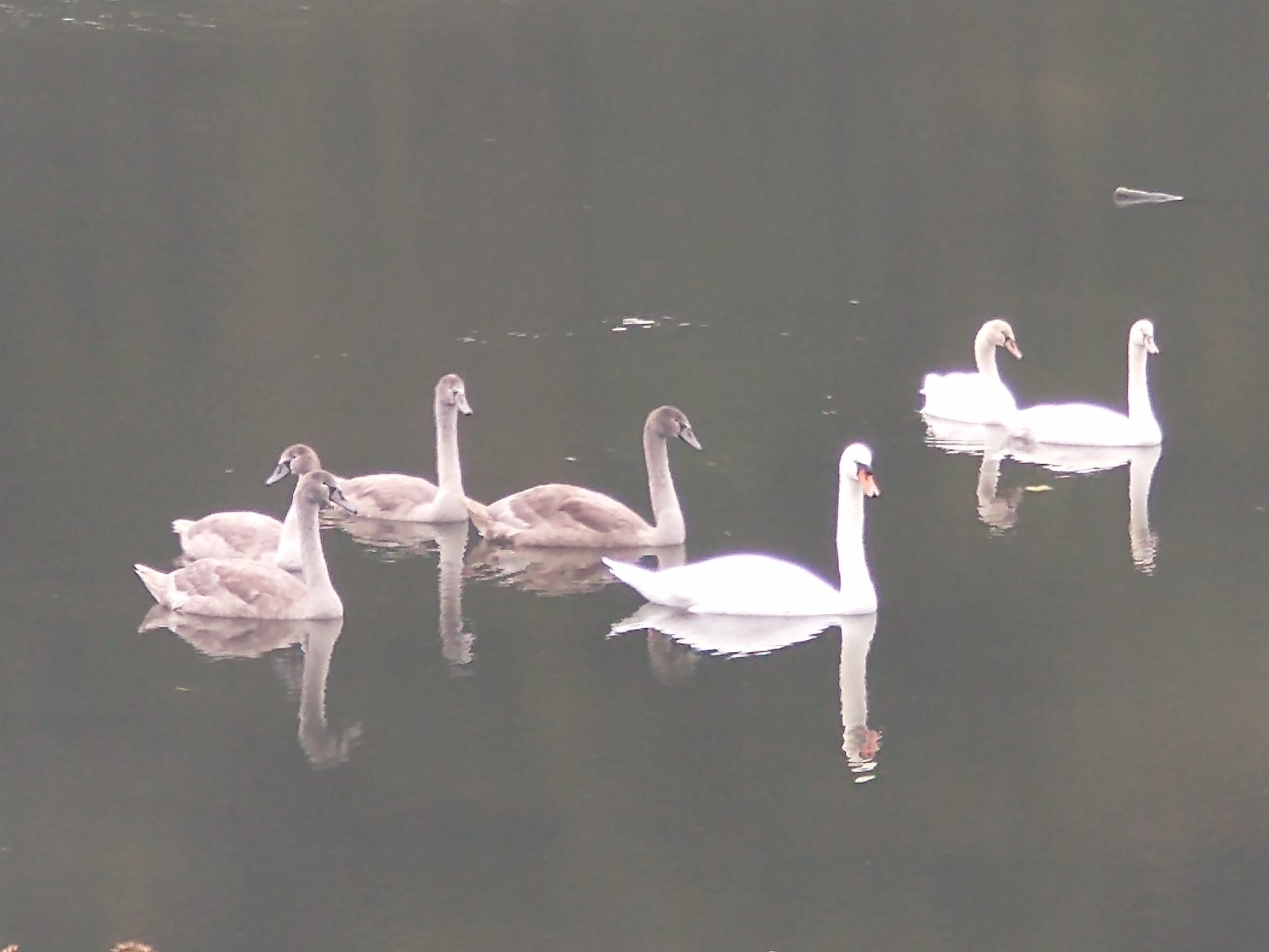 ...Etwas später saß ich am gleichen See an einer anderen Stelle und zu meiner Überraschung kam ein Schwan von der anderen Seite zu mir geschwommen mit sieben kleinen Jungen. Ein schönes tröstendes Bild, ich wusste sofort, daß der tote Schwan der Schwanenpapa (oder die Mama?) sein musste. Sie schwammen alle zu der Stelle hinüber, wo ihr Papa lag, der Schwanenkönig! Er ist in Liebe gestorben. Vielleicht war er wirklich zu alt, hat noch einmal alles gegeben für seine Familie bis zum letzten Atemzug da zu sein und schenkte sein Leben seinen Jungen weiter und vielleicht wird die Schwanenmama sich auch bald zu ihm legen, wenn die großgewordenen Jungen mit den anderen in den Süden fortgezogen sind.