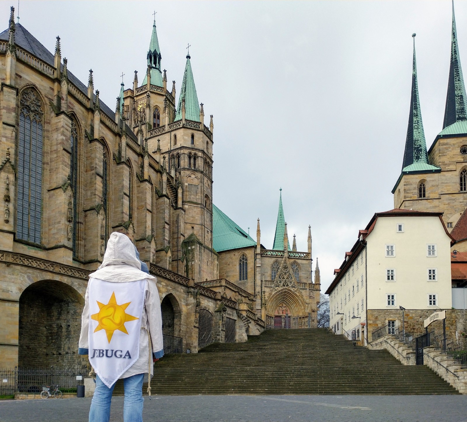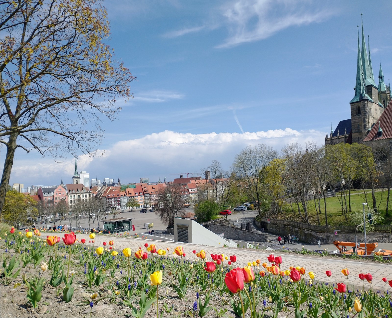 Dieses Foto vom Erfurter Dom machte ich direkt vom Fenster meines Gästezimmer aus am Dom. Eingeladen wurde ich nämlich vor Erfurt von einem älteren Radrennfahrers Wolfgang, der schon nach kurzer Unterhaltung mich zu sich und seiner Frau in ihre Wohnung direkt am Dom zur Übernachtung einlud. Als ich ankam, machten wir noch gemeinsam einen Corona-Schnelltest und bei indischem Essen und tollem Frühstück unterhielten wir uns auch viel über Mahatma Gandhi, da Wolfgang schon zu DDR-Zeiten oft in Indien arbeitete und ihn ebenfalls bewunderte. Vielen Dank, Wolfgang! Selten erlebe ich so eine spontane und herzliche Gastfreundschaft nach nur kurzem Kennenlernen!Eine der "Drei Gleichen" Burgen.Mein Bankgeheimnis fand diesmal direkt vor der BUGA in Erfurt auf dem Vorplatz mit vielen Tulpen statt.