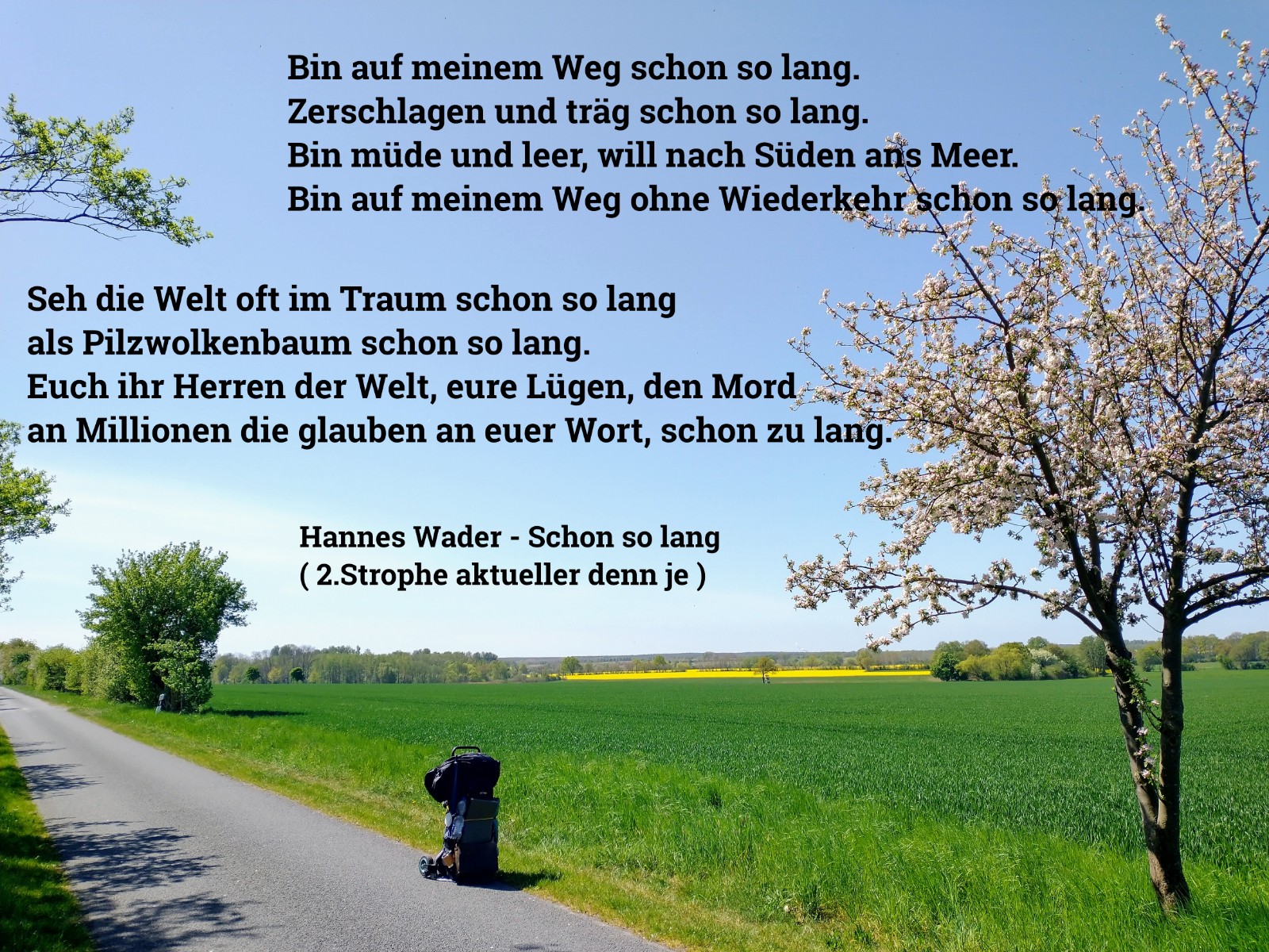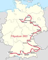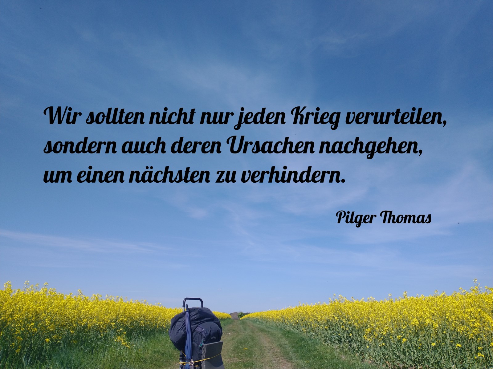 Fazit: Die Pilgertour 2022 stand unter dem Motto "Für die Opfer des ukrainisch-russischen Krieges" und es sollte kein Zufall sein, dass ich gleich am dritten Tag nach dem Start in der Nähe von Hannover einen traditionellen Osterkuchen von einer ukrainischen Flüchtlingsfamilie geschenkt bekam. Die Tour lief wieder wie geplant und ich arbeitete diesmal verstärkt hier und da auf Kost-und-Logi-Basis für 2-3 Tage, um dann wieder weiterzuziehen. Auf den Fußgängerzonen der Großstädte sang ich wieder meine Lieder für Frieden, Liebe, gegen Gewalt und Oberflächlichkeit. Hoffen wir, dass die Spannung und die Gefahr eines großes Krieges in Europa wieder abnimmt. Bis im April 2023 zur nächsten Pilgerreise! Pilger Thomas