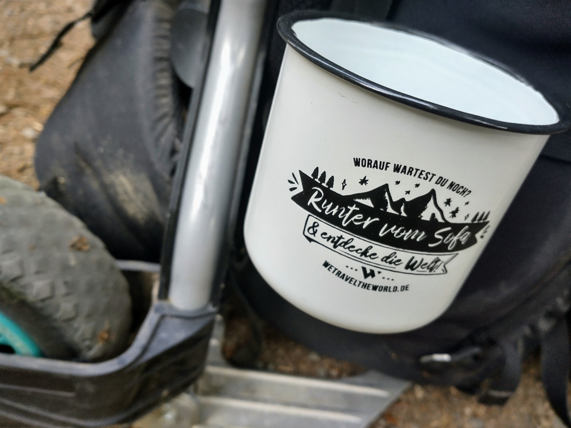 Meine 0815-Trinktasse tauschte ich gern mit dieser als Geschenk angebotenen Tasse und dem passenden Spruch darauf.Diese liebevoll eingerichtete Jakobskapelle war fast so klein, wie mein Wägelchen. Platz zum Gebet hatte auch nur ein Pilger.