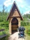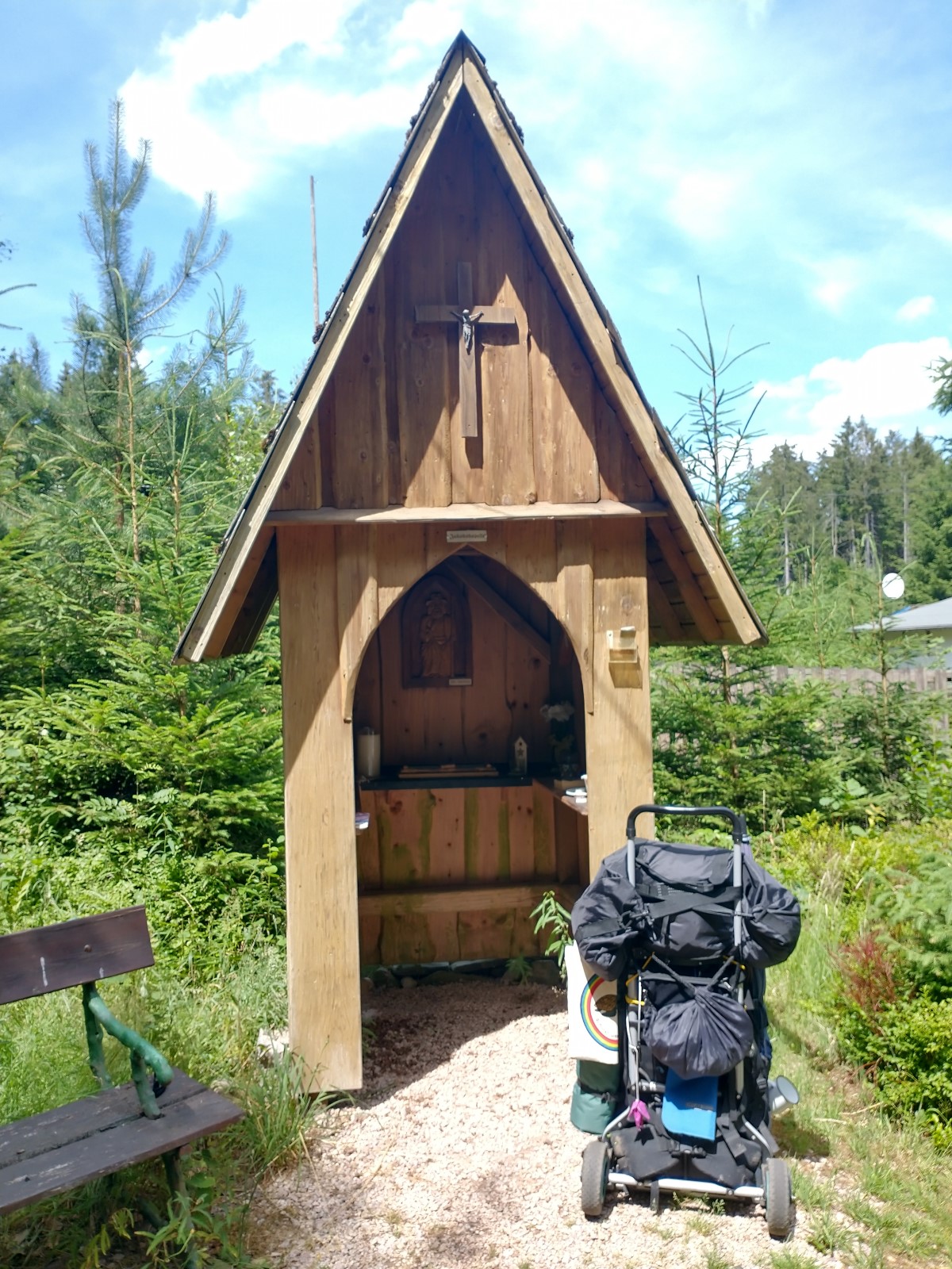 3.Foto: Diese liebevoll eingerichtete Jakobskapelle war fast so klein, wie mein Wägelchen. Platz zum Gebet hatte auch nur ein Pilger.
