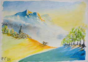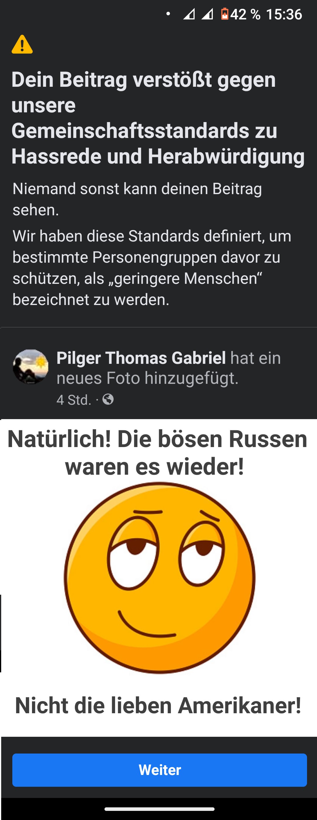 Ich kam endlich mal wieder dazu, ein Aquarell zu malen und zu verschenken, da ich für ein ganzes Wochenende eine Wohnung überlassen bekam, während die Mieterin ihre Mutter übers Wochenende besuchte. Sie erzählte mir bei der Schlüsselübergabe, daß sie mit ihrer Mutter nächstes Jahr den Pilgerweg nach Santiago de Compostella laufern will. Als Dankeschön für die Wohnung malte ich das Bild mit den beiden als Pilgerinnen. 🙂In dem bunten flachen "Rotel In" im Zentrum des Bildes hatte ich eine Nacht zugebracht. Die Zimmer waren so klein wie Schiffs-Kajüten, am Kopfende das Fensterchen und am Fußbereich die Tür und der Einstiegsbereich aufs Bett. Durch den Blick auf das Donauwasser kam ich mir vor, als wäre ich auf einem Kreuzfahrtschiff. Wer genau hinschaut, erkennt, daß die Architektur des Hotels eine schlafende Person darstellt (der linke blaue Gebäudeteil ist der Kopf mit der Nase nach oben.Dieses Screenshot von meinem Handy bzw. Facebook-Account habe ich nachträglich am 28.September eingefügt, als es die Sabotageakte auf die russischen Erdgas-Piplines in der Ostsee gab. Natürliche vermuteten die meisten im Mainstream, daß es nur die "bösen Russen" selbst sein konnten, was mir aber widersinnig erschien. Warum sollte ein Staat seine eigenen Pipelines zerstören, die er mühsam aufgebaut hat und durch die er mal was verdienen will? Konnte so eine Sabotage nicht auch im Auftrag der Amerikanern durchgeführt worden sein? Die Motive und manches hinterhältige Verhalten der Amerikaner in den letzten Jahrzehnten sprechen dafür. Naja, der angreifende Zynismus meines Posts wurde vom FB-Mitarbeiter oder -automaten (?) nicht verstanden, gelöscht und ich bekam eine Verwarnung. Ich benutze Facebook sowieso nur als Plattform, damit Leute sich auf diese meine Homepage hier ganz ohne Werbungs- und Verblödungsmechanismen "verirren" und deshalb bin ich auf Facebook erstmal wieder eine Weile "lieb" und still. 🙂