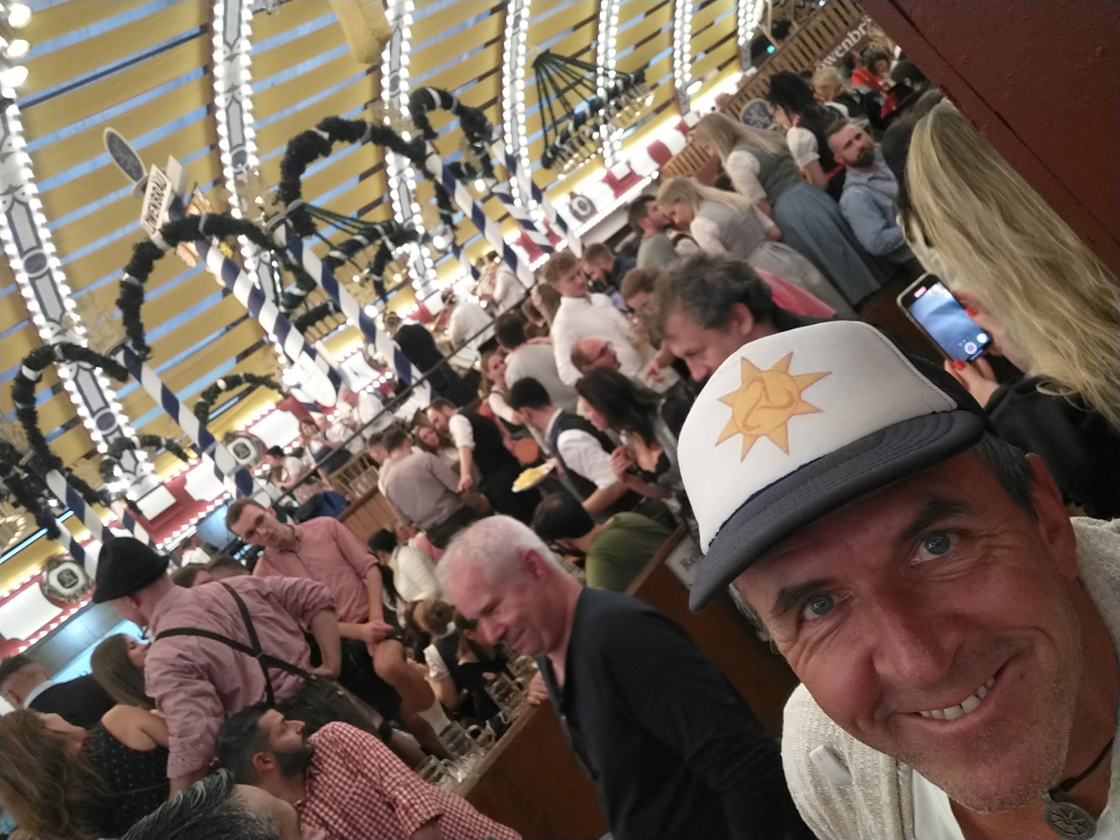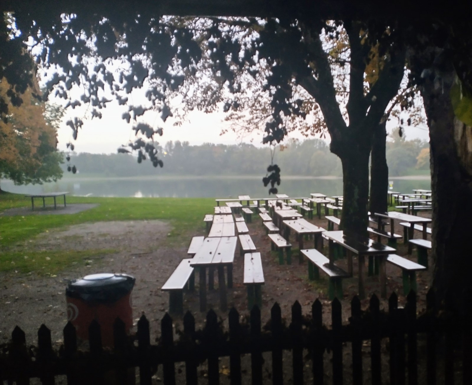 In München war ich zufällig auch während des Oktoberfestes und tatsächlich wurde ich einmal von lieben Gastgebern eingeladen und in kompletter Kluft eingekleidet und einmal bin ich in meiner Dienstkleidung hindurchspaziert (3.Foto). Da ich in einem Festzelt ein 5-Euro-Schein auf dem Fußboden fand, war dies für mich das sichere Zeichen, dass ich ein Bier zum normalen Preis trinken kann. Eine Nacht verbrachte ich unter einem Vordach eines Biergartens am See und die feuchten Tische und Bänke vermitteln die feuchte "Feststimmung", als ich wieder aufstand (4.Foto).