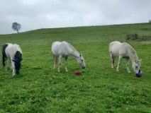 3.Foto: Bei einem Arbeitseinsatz in einem Seminarhaus ergab es sich durch einen Krankheitsfall, dass ich einige Tage drei Pferde außerhalb des Ortes versorgte, zu denen ich früh und abends mit Don, einem ohne Leine freilaufenden Hund, regelmäßig hinlief. Das genoss ich sehr, eine Weile mit Tieren so eng zu arbeiten.