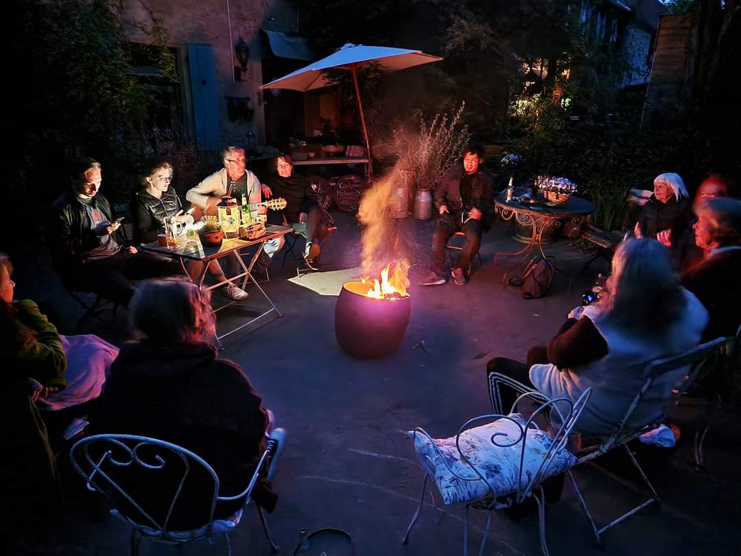 4.Foto: Auf dem Rittergut in Endschütz bei Gera habe ich zum Frühlingsfest einige Tage ausgeholfen und abends saßen wir Mitarbeiter um einer Feuerschale und sangen viele Lieder.