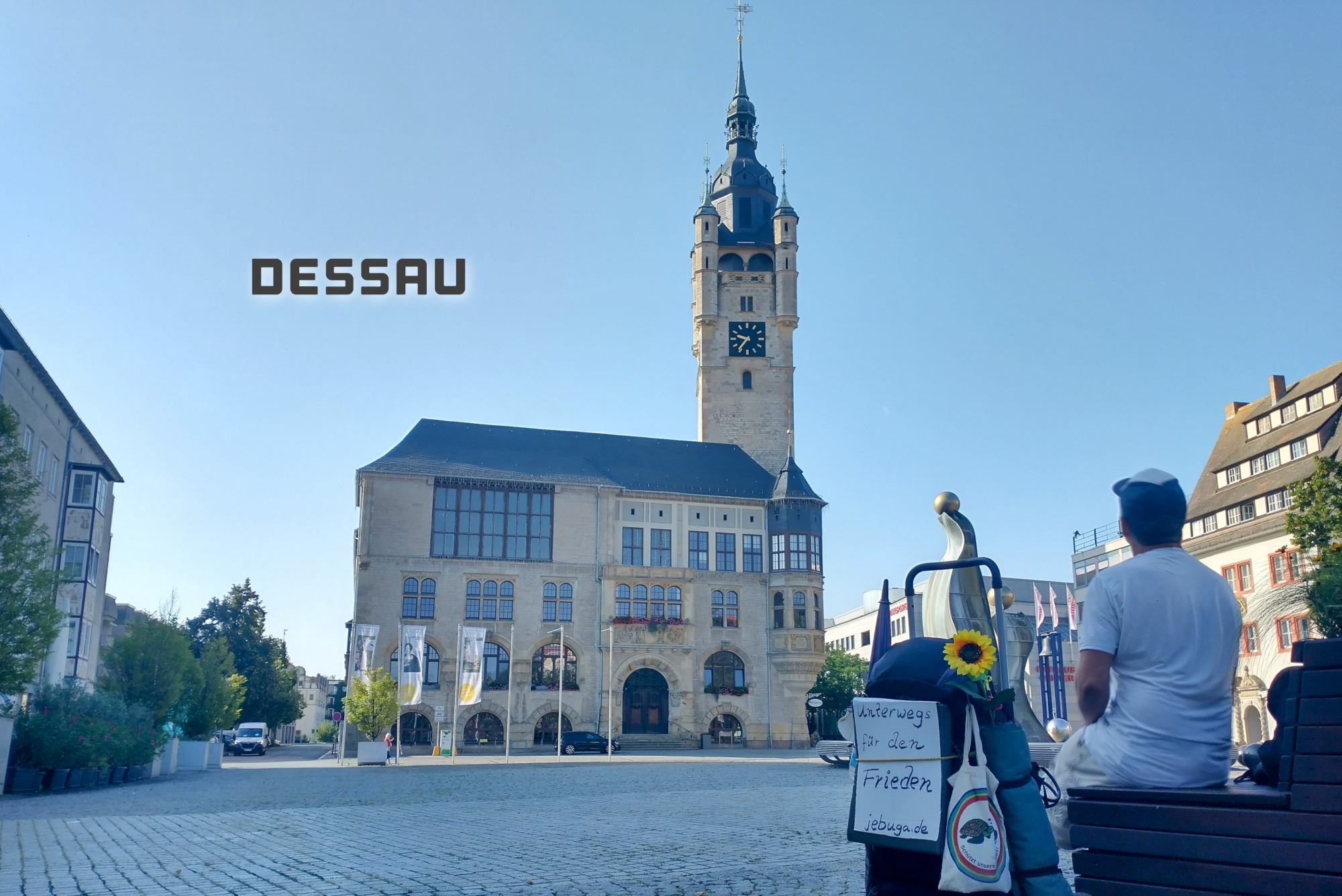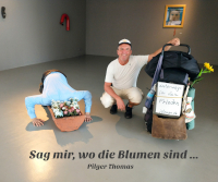 5.Foto: In Dessau lief ich an einer Kunstausstellung vorbei und entdeckte durch die offene Tür diesen Mann, der sein Kopf in einen Blumentopf steckte. Es sah so ungewöhnlich und trotzdem echt aus, dass ich neugierig hineinschaute. Eine ältere Frau am Infotisch begrüßte mich und erklärte, dass es sich bei dieser Kunstausstellung "33 Grad" um Werke des Künstlers Sandro Porcu handelt. Das Kunstwerk trägt zwar den Titel "Den Himmel kennen wir schon", aber ich deutete es auch um mit dem Titel "Sag mir, wo die Blumen sind..."