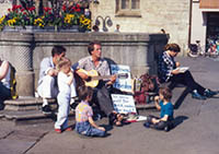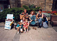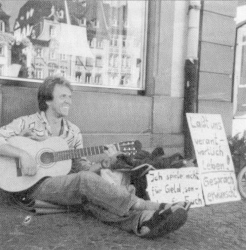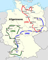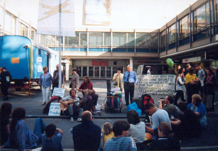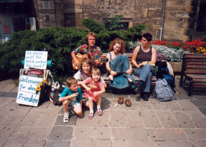 Während meiner damaligen Pilgerreisen in den 90er Jahren lebte ich fünf Jahre lang ohne jegliche Ausweise und Verbindungen zum Staat, praktisch staatenlos. Damals hatte ich immer noch meine Gitarre bei mir und spielte mit einem Schild "Ich spiele nicht für Geld, sondern für euch!" ohne Becher oder Hut auf den Fußgängerzonen der Großstädte. Schon damals versuchte ich zwischenzeitlich meinen Rücken zu schonen, indem ich mir Räder an den Rucksack baute. In dieser Zeit verteilte ich ein kleines Heftchen "Unterwegs für den Frieden", welches ich unterwegs in Copyshops immer wieder vervielfältigte, mit einem Fellchen verbunden mit der Geschichte "Die kleinen Leute von Wippidu" mit Nadel und Faden zusammenband und verschenkte. Ich sah mich damals auch als "Friedenspilger" und überwinterte in der kalten Jahreszeit in Landgemeinschaften oder bei Bekannten/Freunden. Diese ersten Pilgerjahre waren sehr erfahrungsreich und prägend für mich. Ich beendete die Zeit, weil ich Vater wurde und ich auch dieser Verantwortung nachgehen wollte und ich das Pilger- und Familienleben als nicht vereinbar sah.
